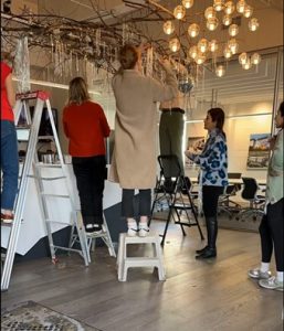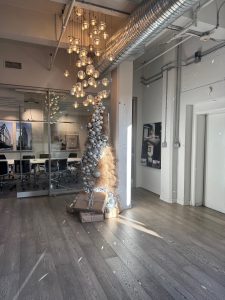 MC: Oh, it’s definitely a group effort. Not only does the team help with completing the installation in a short timeframe, but they also add ideas I never thought of. Last year, I had to elevate the tree with a crate, and someone went out to purchase accessories to hide the base of the tree, which ended up enhancing the whole design. Another person found the perfect placement, so the sunlight hits the disco balls just at the right spots. The magic happens when everyone adds their touch.