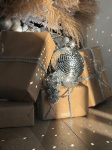 MC: Oh, it’s definitely a group effort. Not only does the team help with completing the installation in a short timeframe, but they also add ideas I never thought of. Last year, I had to elevate the tree with a crate, and someone went out to purchase accessories to hide the base of the tree, which ended up enhancing the whole design. Another person found the perfect placement, so the sunlight hits the disco balls just at the right spots. The magic happens when everyone adds their touch.